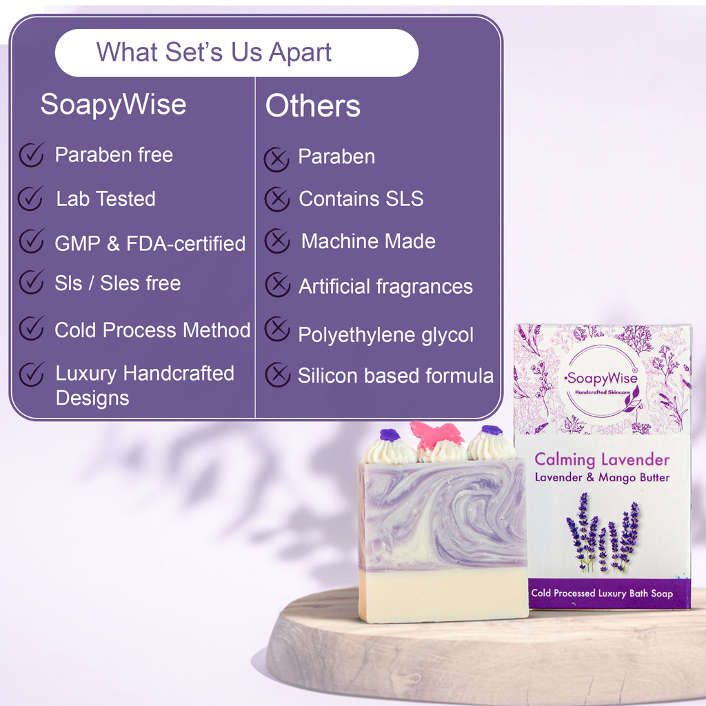 Indulge in the soothing and luxurious experience of our FDA-approved Lavender and Mango Butter Cold Processed Soap. This soap blends the finest natural ingredients to provide gentle cleansing, deep hydration, and a calming lavender scent.