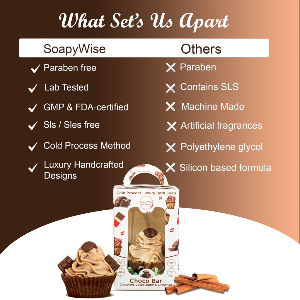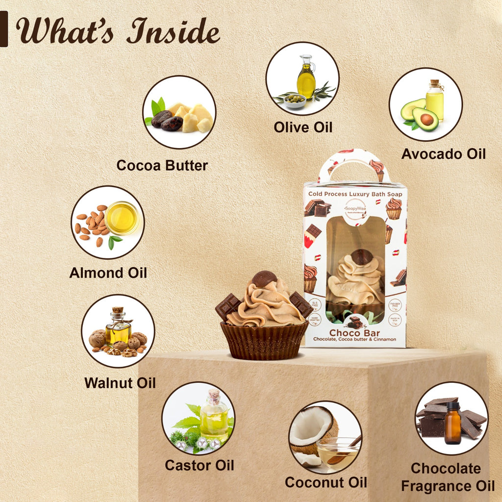 Indulge in a decadent bathing experience with our Choco Bar Cupcake Soap, crafted to nourish your skin while delighting your senses. Handmade using the cold process method, this soap retains natural glycerin for deep hydration and long-lasting moisture. Infused with rich chocolate, cocoa butter, and a hint of cinnamon, it provides a warm, soothing, and rejuvenating cleanse, leaving your skin soft and radiant.